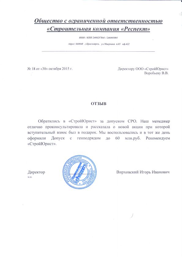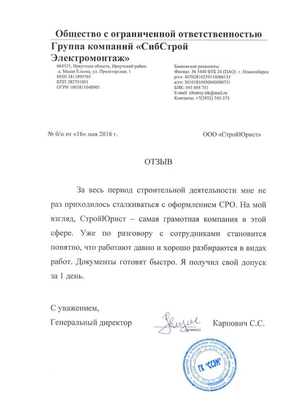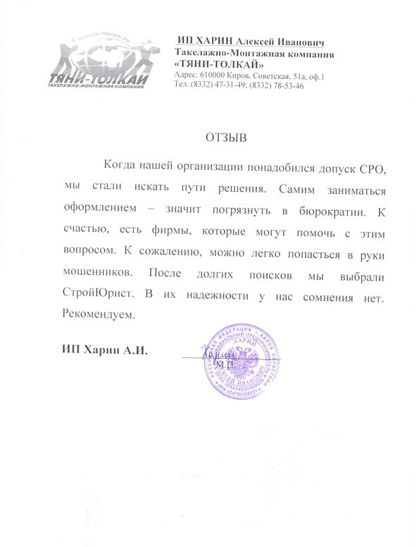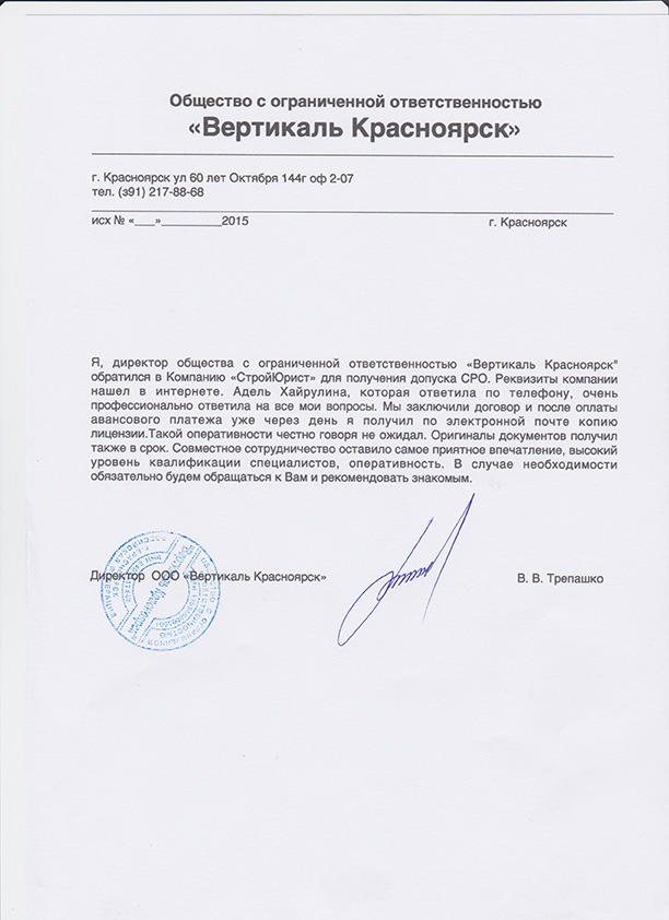 Отзывы клиентов "СтройЮрист" по вступлению в СРО в Норильске